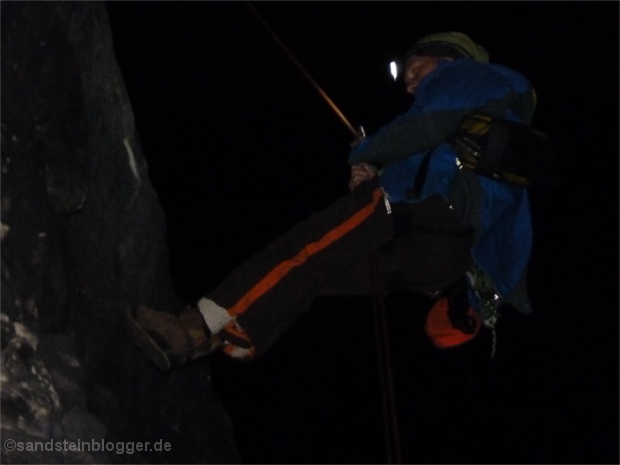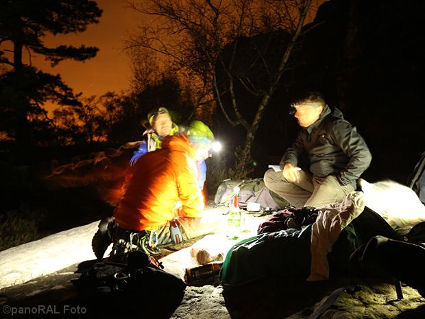 Nicht lange danach sind wir an der Tante. Der Felsen bietet ein skurriles Bild. An seinem Fuß hockt – eingemummelt in einen orangefarbenen Kunstfaseranorak – Denis vor einem dampfenden Topf voll Linsen. Daneben liegen leere Plasteflaschen. Mineralwasser. Bier. Die beiden Leipziger haben es sich gut gehen lassen, während wir durch den pechschwarzen Wald gestolpert sind. Anscheinend haben sie es nicht allzu eilig, der Tante aufs Dach zu steigen. Ich kann es ihnen nicht verdenken. Schier endlos reckt sich die majestätische Felsnadel über unseren Köpfen in den Nachthimmel. Weder Griff noch Tritt sind in der Wand zu erkennen. Ist die ganze Aktion nicht vielleicht doch ein bisschen zu verrückt? Über dem sogenannten Mittelweg baumelt ein Seil. Das haben Denis und Ralf dort hängenlassen. Vorsichtshalber sind sie schon im Hellen auf den Gipfel gestiegen und haben das nächtliche Manöver bestmöglich abgesichert. Ralf ist von Beruf Industriekletterer und weiß anscheinend, was er tut. Auch Denis ist kein durchgedrehter Adrenalin-Junkie, sondern seit seiner Kindheit in den Felswänden der Sächsischen Schweiz zu Hause. Ich muss mir um die beiden wohl keine allzu großen Sorgen machen.