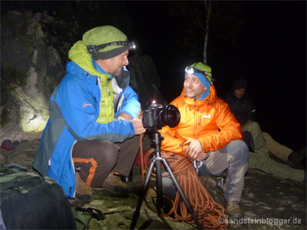 Doch zuvor muss Thomas erst mal im Schneckentempo 50 Meter weit durch den Wald schleichen – nur alle 20 Sekunden einen Schritt, so verlangt es die Zeit-Automatik der Kamera oben auf der Aussicht. Und schließlich dann über einen Grat zur Tante hinüberkraxeln. Der hat es anscheinend in sich. Denn obwohl er bei seinen Nachtwanderungen im Elbsandstein wohl so mancherorts in einem tiefen Loch verschwinden könnte, hat Pöschmann vor dieser Etappe besonderen Respekt. „Da geht es auf jeder Seite gefühlte 5000 Meter tief runter“, flunkert der Stolpener theatralisch – das Unbehagen in seiner Stimme ist aber echt und nicht zu überhören. Die 5000 Meter sind freilich arg übertrieben. Der höchste Berg der Sächsischen Schweiz bringt es auf gerade mal 561 Meter. Aber im Licht einer Stirnlampe verschieben sich hier so manche Relationen. Ist der Grat geschafft, kommt der schwierigste Teil – die 25 Meter hohe Südwand der Tante. Doch das ist dann nicht mehr Pöschmanns Part. Am Fuß der markanten Felsnadel warten Denis Thomas und Ralf Görner auf uns, zwei versierte Kletterer aus Leipzig.