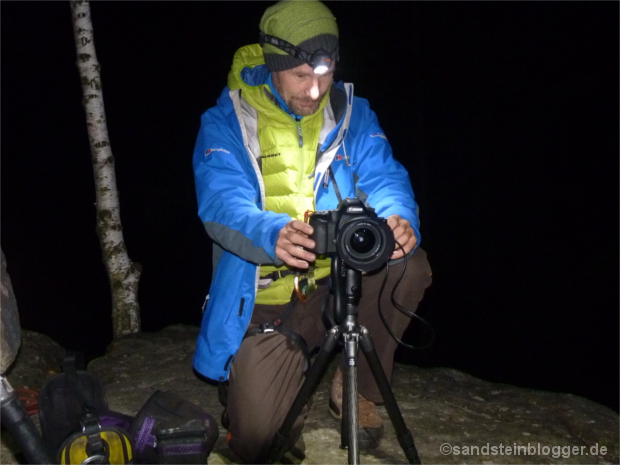 So verschwinden mit der Zeit die letzten Platzhalter aus der Endfassung des neuen Films. Drei Monate arbeitet die Stativkarawane inzwischen an ihrem Stirnlampen-Projekt. Auch andernorts waren die geheimnisvollen Irrlichter unterwegs – auf der Basteibrücke, am Pfaffenstein, an der Kaiserkrone… Morgen wird Thomas Pöschmann wieder Hunderte Bilddateien auf seinen Rechner laden und zu einer neuen Zeitraffer-Sequenz zusammenschneiden. Von unserem Abenteuer werden vielleicht 30 Sekunden übrigbleiben. Wer sich der Landschaftsfotografie verschreibt, darf keine Wunder erwarten. Bevor etwas richtig gut gelingt, gibt es viele Enttäuschungen. Oft ist die Ausbeute einer Nacht wie beim Goldwaschen kaum der Rede wert. Falls der Himmel zuzieht, der Akku versagt, das Mondlicht blendet oder der Dunst aus dem böhmischen Becken vor die Linse treibt, geht man mit kalten Füßen und leeren Händen wieder heim. Die Nacht kommt, wie sie kommt. Ich setze meinen Rucksack ab. Geduld ist alles im Fotografenhandwerk. Ich glaube, auch ich habe irgendwo in meinen Taschen noch ein Bier.