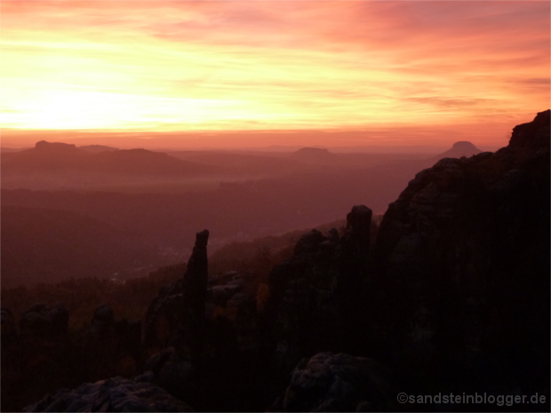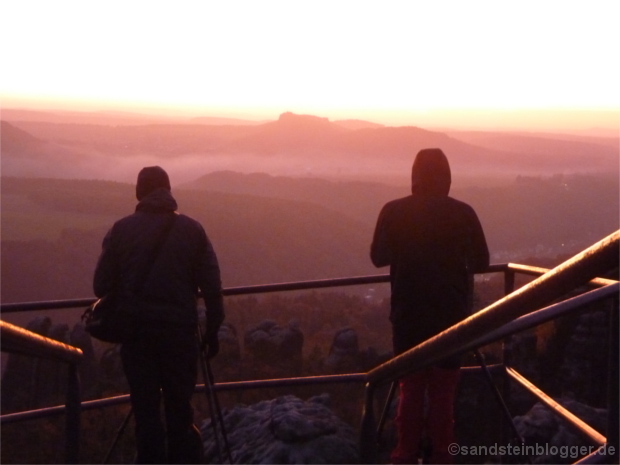 Meine Gedanken wandern wieder hinauf zu Anna, die auf der Schrammsteinaussicht tapfer in der Kälte kauert. So stelle ich mir die Steinzeit vor. Männer ziehen raus ins Abenteuer und kehren heim, beladen mit Fellen und spannenden Geschichten. Und die Frauen trifft das wenig erbauliche Los des Wartenmüssens. Ich könnte es Anna nicht verübeln, falls sie sich dem vorsintflutlichen Rollenschema dieser Nacht nachher noch handgreiflich widersetzt. Aber vielleicht irre ich mich. Vielleicht ist die Panoramasicht von dort oben sogar der beste und spannendste Platz bei unserem Abenteuer.