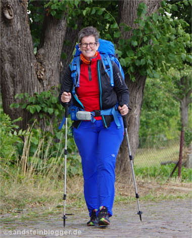 Wir begegnen uns in Skassa, einem winzigen Dorf im Landkreis Meißen. Bruni sitzt unter grünen Apfelbäumen im Garten des Pfarrhauses, das gleichzeitig als örtliche Pilgerherberge fungiert: eine Frau Anfang 50 mit wachen, lebendigen Augen und kurz geschnittenen Haaren, die ihrem Gesicht etwas Hartes verleihen, das nicht so recht zu ihrem unbekümmerten Wesen passen will. Während wir uns unterhalten, futtert sie mit sichtlichem Appetit eine Tupperdose Haselnüsse und Rosinen leer. Der Körper braucht Kalorien nach den Strapazen des Weges. Fünf Tage ist sie schon unterwegs, 126 Kilometer. Kaum der Rede wert, wenn man bedenkt, was noch vor ihr liegt.