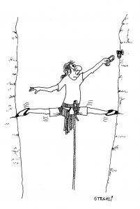 „Hab ich alles erlebt, ist mir alles schon passiert“, bemerkt er nüchtern, während er an seinem Küchentisch einen dicken Haufen Karikaturen durchblättert. Strahli hat sich zum Beispiel mal einen Felskamin hinaufgeschunden, der so eng war, dass ein Fastenlehrer darin verzweifelt wäre. Er hat sich schließlich sogar aus dem Seil ausgebunden, um hindurch zu passen. Strahli weiß, wie Sandstein schmeckt. Er hat schon in eine Felskante gebissen, weil ihm beim Klettern „die dritte Hand fehlte“. Und er weiß, wie es sich anfühlt, wenn man auf einem Gipfel steht und sein Seil davonfahren sieht. Wenn man den Strick, im Glauben, ihn durch die Abseilöse gefädelt zu haben, versehentlich zu Tale wirft.