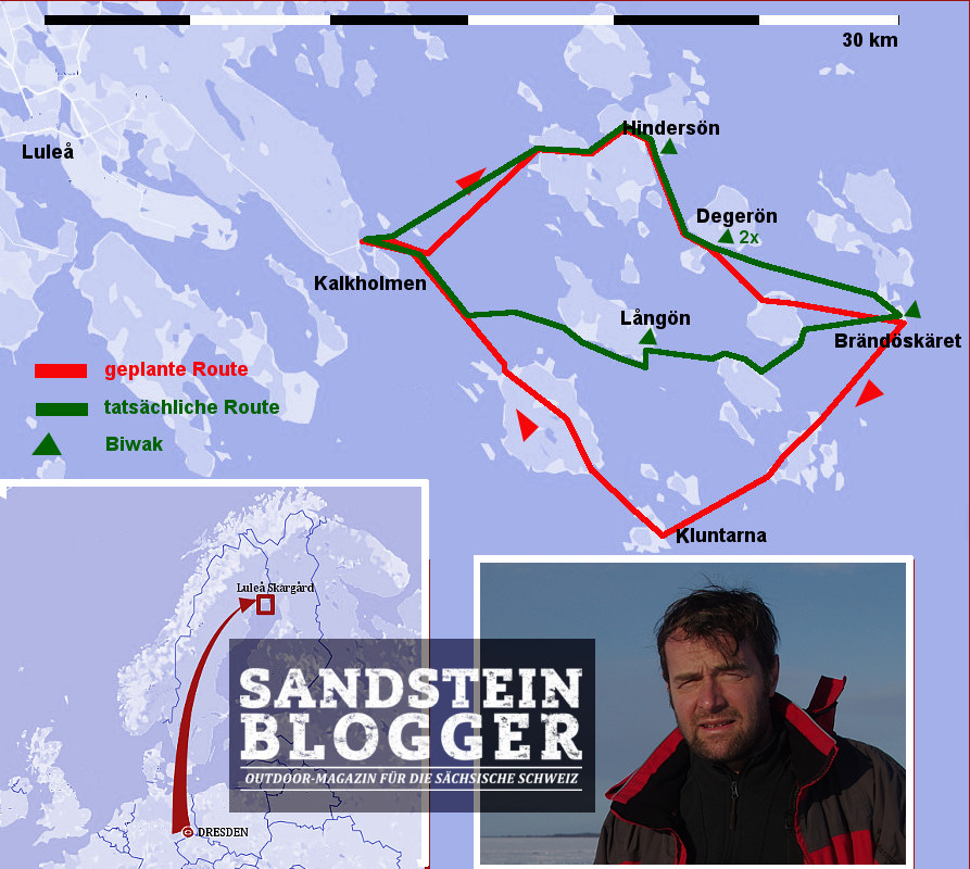 Gegen Mittag entdecke ich in der Ferne die ersten Autos. Mitten auf dem Meer. Das ist die Eisstraße von Storbrändön nach Kalkholmen. Vor Tagen war sie wegen des Schneefalls noch gesperrt. Ich bin am Ziel. Bald darauf erreiche ich die ersten Tannenbäume, die abseits der Straße als Leitpfosten für die Schneemobilfahrer aufgepflanzt werden. Mein innerer Schweinehund, den ich sechs Tage an der kurzen Leine hatte, meldet ich zurück und sonnt sich schon heftig in der Gewissheit, am Abend ein Bier zu trinken. Das ist in Ordnung, meinetwegen kann er jetzt die Oberhand gewinnen! Ich bin zufrieden und fühle mich beschenkt. Der Amerikaner John Muir, geistiger Vater der Nationalparkidee, hat einmal gesagt: „Bei jedem Schritt in die Natur bekommt man weit mehr als man sucht“. Das stimmt. Und der Fischer Leif Holmberg? Der Mann im Eismeer, den ich unbedingt kennenlernen wollte? Nun, ich habe ihn getroffen. Aber das ist eine andere Geschichte…*
