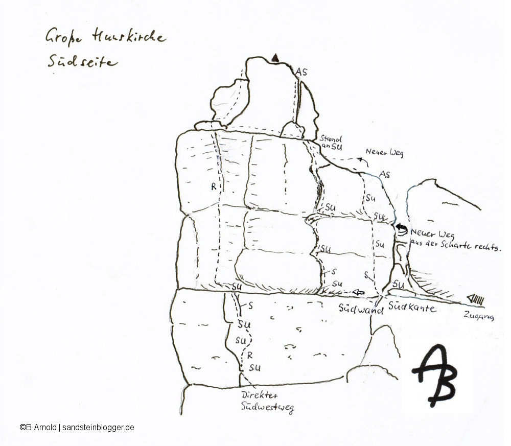 Zum ersten Mal in Berührung mit diesem Gipfel kam ich 1963, inzwischen war ich auch ich bereits Mitglied und stolzer Träger des Klubabzeichens von „HKV 38“ geworden. Das kam so: Damals erschien das erste Lehrbuch zum Sächsischen Felsklettern, verfasst von Kurt Bruno Richter (das Dietrich Hasse daran den größten Anteil hatte, war mir noch unbekannt). Kurt B. Richter wohnte in Waitzdorf, also ganz nah bei Hohnstein. In tiefster Bewunderung klingelte ich an seiner Tür. Der Kontakt erwies sich bald beiderseitig als stimmig. So auch mit seinem Jugendfreund Helmut Großer, den ich ebenfalls bewunderte. Trotz einer beschädigten Hand leistete er, von Begeisterung getragen, noch Großartiges am Fels. Umgehend wurde ich in ihren Kletterklub „Hunskirchler 38“ aufgenommen. Das war ganz in meinem Sinne: Als steter Träger von Kniebundhosen war ich damals überzeugt, auf dem Wege zum „richtigen Bergsteiger“ einen großen Schritt getan zu haben: Ich war Mitglied in einem ehrwürdigen Kletterklub mit Klubabzeichen! Es wurde eine kurze, aber sehr intensive Zeit. Im Herbst 1963, nach dem Tod (Absturz) von Helmut Großer, fehlte der sportliche Motor des Klubs und unsere Interessen verliefen sich in stufenweisen Abständen.