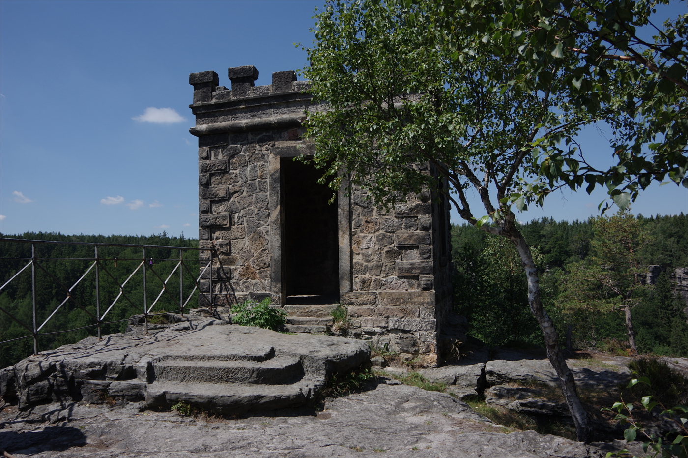 Um zu begreifen, wie das funktioniert, muss man die beiden Zeitschleusen am Anfang und Ende des Weges beachten. Sie sind zwar unsichtbar, aber wenn man offen für solche Betrachtungsweisen ist, kann man durchaus ihre Wirkung spüren. Eine befindet sich kurz vorm Eingang zur Felsengasse an den Herkulessäulen – die andere auf der gegenüberliegenden Talseite, etwa in Höhe des Tunnelwegs an der Johanniswacht. Auf dem Hinweg begegnet einem schon nach einer Viertelstunde die erste Merkwürdigkeit: Verwegen auf einer Klippe hoch überm Tal thront die sogenannte Kaiser-Wilhelm-Feste, ein aus Sandsteinen gemauerter Pavillon mit Zinnen und Scharten. Einer Tafel im Inneren zufolge wurde er um 1880 von einem Rosenthaler Baumeister errichtet, die Idee soll einer bierseligen Stammtischrunde entsprungen sein. Viel wahrscheinlicher handelt es sich dabei aber um das sagenumwobene Torhaus an der Pforte zur Vergangenheit – und dorthin soll unser Weg ja auch führen. Bald darauf biegt er rechts scharf um die Ecke und taucht zwischen Felsen und Blöcken hinab ins Erdmittelalter und auf den Meeresgrund.