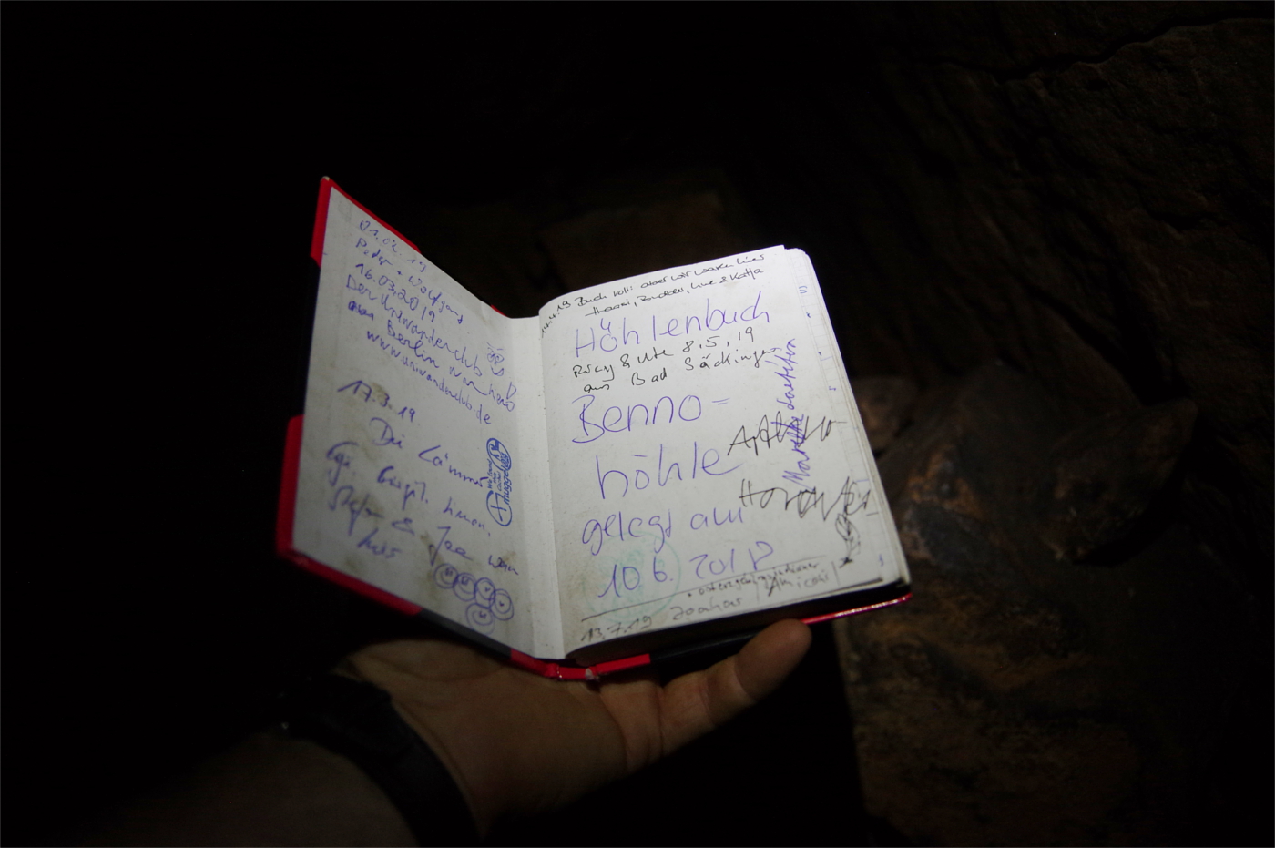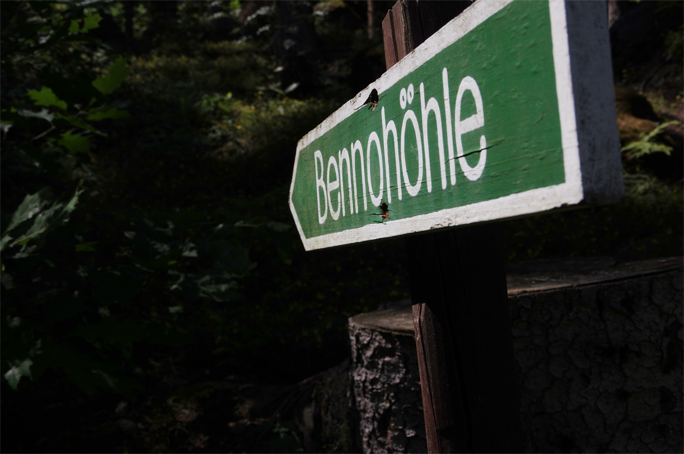 Inzwischen haben wir bachaufwärts den Ortsteil Ottomühle erreicht. Keine fünf Minuten später und etwa 100 Meter vor der Bergwachtstation schlägt sich rechts zwischen den Häusern hindurch ein kleiner Weg seitwärts ins Gebüsch und bergauf. Ein Stück oberhalb vom Dorf befindet sich eine der größten Höhlen der Sächsischen Schweiz: die Bennohöhle. Drinnen riecht es modrig, die Luft ist süß und kühl. Zwei Stockwerke sind problemlos begehbar. In einer Felsnische im Untergeschoss welkt in einer nicht ganz luftdichten Plastedose das Höhlenbuch vor sich hin. Es ist still – geradezu zeitlos still.