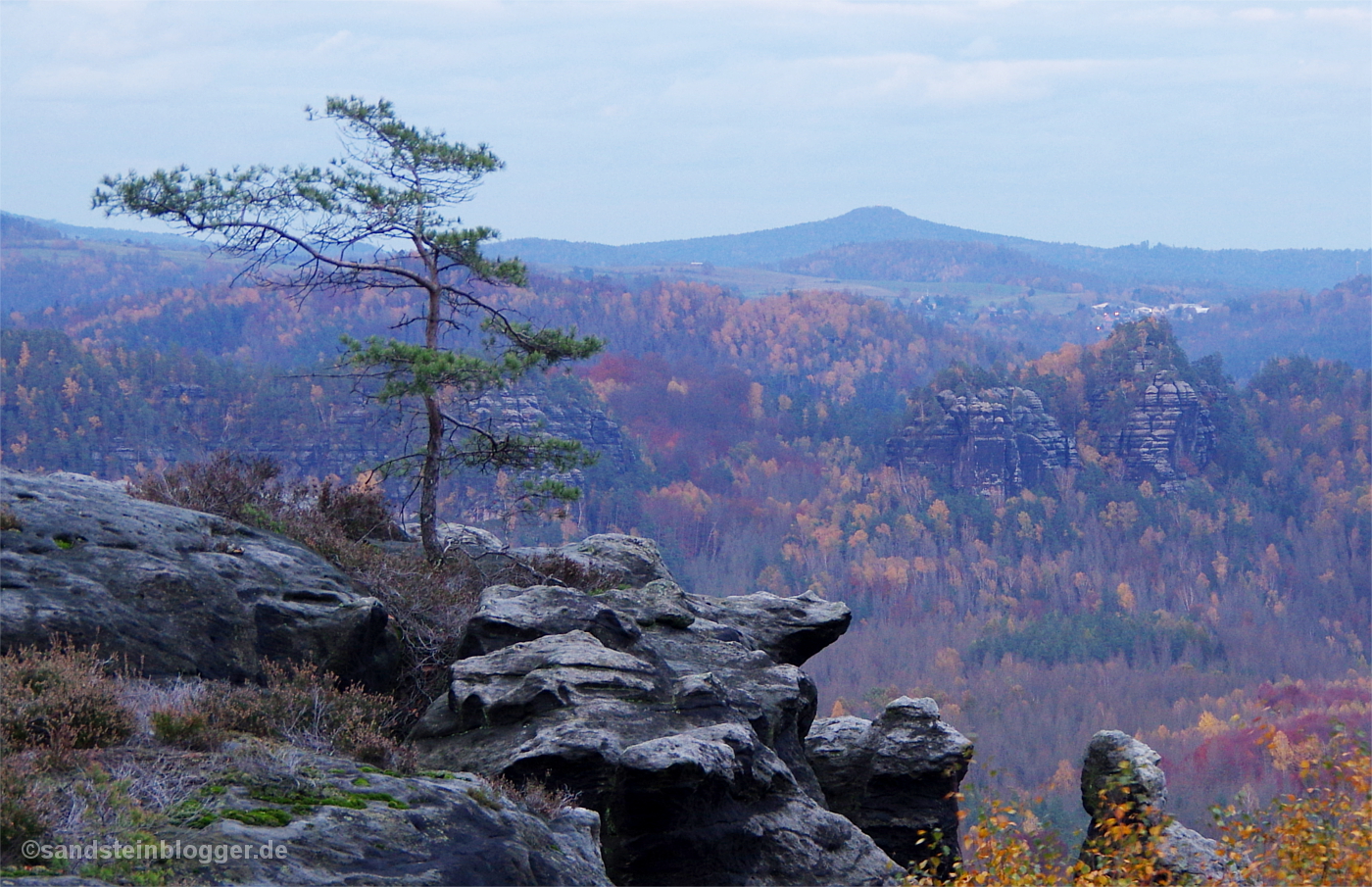 Aufgenommen wurde es vor fast anderthalb Jahrhunderten von einem Meister seines Fachs: 1884 von Hermann Krone. Der sächsische Foto-Pionier ist einer der frühen Wegbereiter der Landschaftsfotografie. Von ihm stammen die ersten bekannten Aufnahmen der Sächsischen Schweiz, aber auch einzigartige Bilder aus anderen Gebirgen der Welt – so z.B. eines der ältesten Fotos aus dem Yosemite-Valley, USA. Ein Mann, der einen untrüglichen Blick fürs große Panorama hatte. Das sieht man seinen Bildern an, auch jenem aus dem Jahr 1884. Aufgenommen im Gebiet des Kleinen Winterbergs, im Vordergrund ein fast blankes Riff, nur mit etwas Moos und Heidekraut bewachsen. Und mittendrin in einer Felsscharte: ein einzelnes kleines Bäumchen, eine Kiefer. Dahinter das grandiose Amphitheater des Kleinen Zschands mit dem Hinteren Raubschloss, den Pechofenhörnern und dem Teichstein in der Ferne. Der Fichtenwald, damals noch jung und niedrig, reicht den Felsen gerade mal bis zum Fuß. Viel hat sich seitdem im Kleinen Zschand verändert. Die Fichten wurden groß und stattlich und beherrschten das Tal. Manche Felswand verschwand im Grünen. Dann kam der Borkenkäfer. Jetzt stirbt der Wald. Geblieben von den Bäumen auf Krones Foto ist nur ein einziger: die kleine Riffkiefer in der Mitte. Beinahe unverändert steht sie dort – einsam und struppig, mit einem Knick in der Mitte. Ihre Krone ist heute etwas breiter, so als habe sie die dünnen Arme nach beiden Seiten ausgestreckt. Ansonsten ist sie augenscheinlich keinen Zentimeter gewachsen.