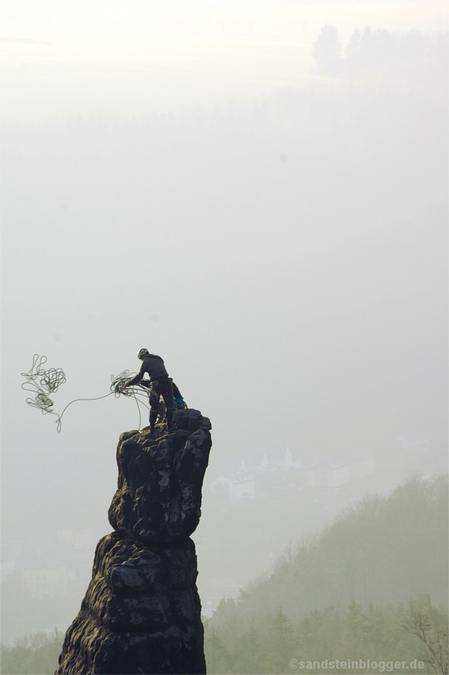 Kletterer auf der Tante im Schrammsteingebiet. Die Poesie des Traditionellen – Gipfelerlebnis und Seilschaft. (Foto: Hartmut Landgraf)