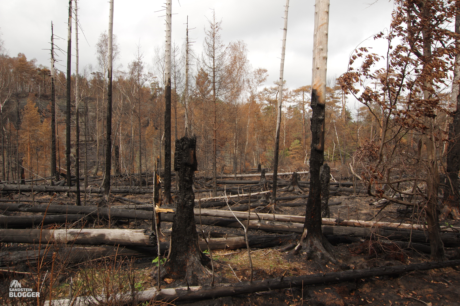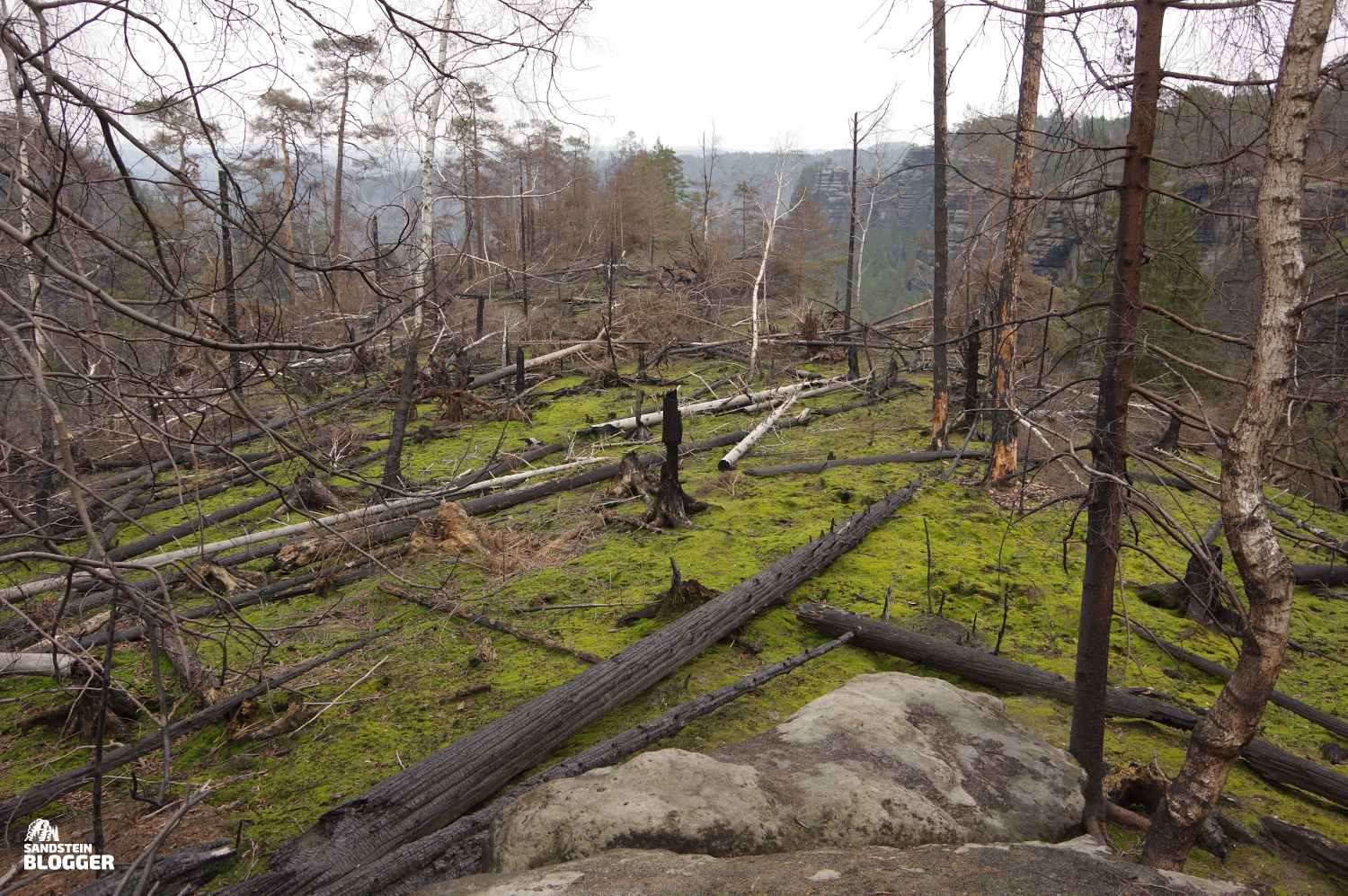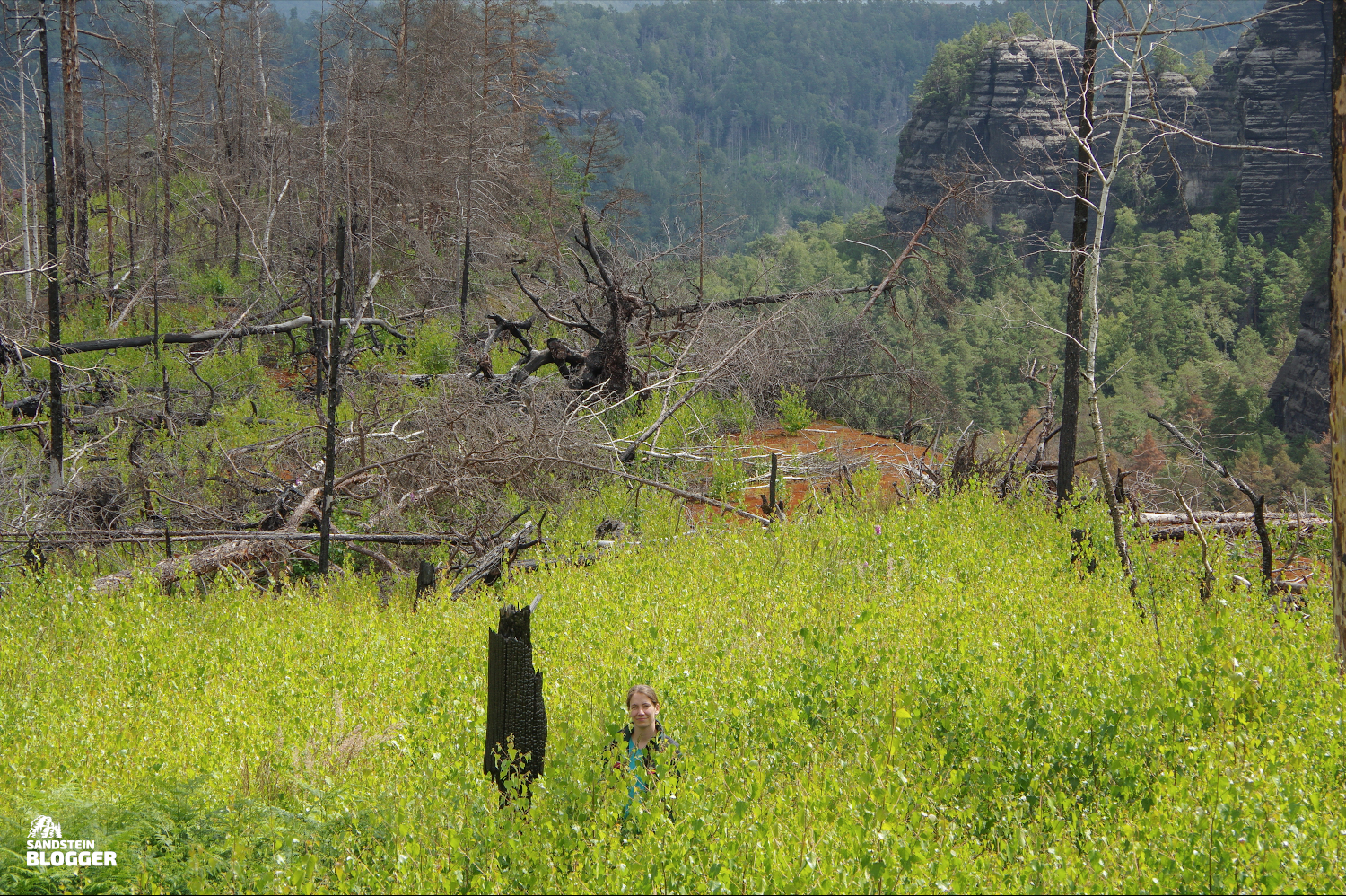 Wenn Annika Busse beschreiben soll, was sich seit dem verheerenden Waldbrand vor zwei Jahren in den Richterschlüchten verändert hat, benutzt sie ein Wort aus dem IT-Bereich: „Reset“. Ein kompletter Neustart des Systems. Das romantische Landschaftsbild von früher existiert nicht mehr. Vom Wald am Ausgang der Schlucht, zwischen Krinitzgrab und Roßsteig, sind kaum mehr als ein paar verkohlte Stubben übrig. Wo sich einst ein lauschiger Pfad im Halbdunkel der Fichten dahinschlängelte, liegt das Tal heute offen wie eine Braunkohlegrube in der prallen Sonne. Nur die tiefer gelegenen Teile der Richterschlüchte blieben vom Feuer verschont. Insgesamt gingen im sächsischen Elbsandstein 115 Hektar Wald in Flammen auf.