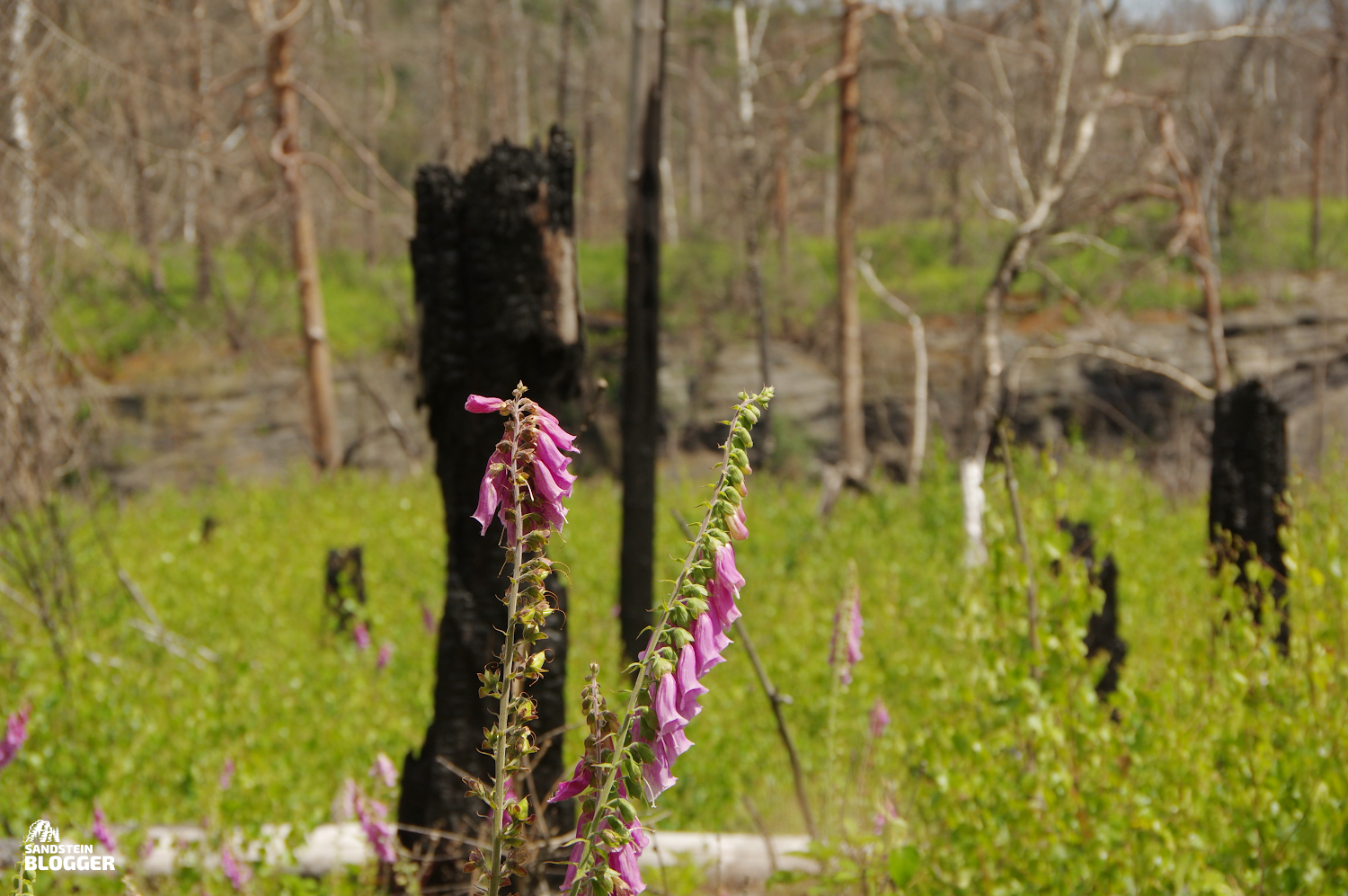 Bis diese sich schließen lassen, werden noch viele Monate vergehen. Eine erste größere Auswertung ist frühestens 2025 zu erwarten. Schon jetzt zeichnet sich aber die eine oder andere Überraschung ab. Birke, Adlerfarn und Fingerhut gehören nicht dazu. Doch manches, was auf den Brandflächen nachkommt, wurde in der Sächsischen Schweiz noch nie nachgewiesen. So fanden die Wissenschaftler in den Richterschlüchten z.B. zwei Pilzarten, die im Elbsandstein bis dato unbekannt waren – Arrhenia bryophtora und Bryopistillaria clavarioides. Außerdem wurde eine äußerst seltene Käferart entdeckt: der schwarze Kiefernprachtkäfer – ein echter Waldbrand-Spezialist! Wie Studien zeigen, kann das Insekt eine Brandfläche aus einer Distanz von bis zu 80 Kilometern wahrnehmen, und es gehört zu den Ersten, die sich – schon bald nach dem Abklingen des Feuers – inmitten von Asche und noch glutheißen Baumruinen neuen Lebensraum erobern. Sogar eine Gottesanbeterin wurde inzwischen im Nationalpark gesichtet – ein Zuwanderer aus südlicheren Gefilden.