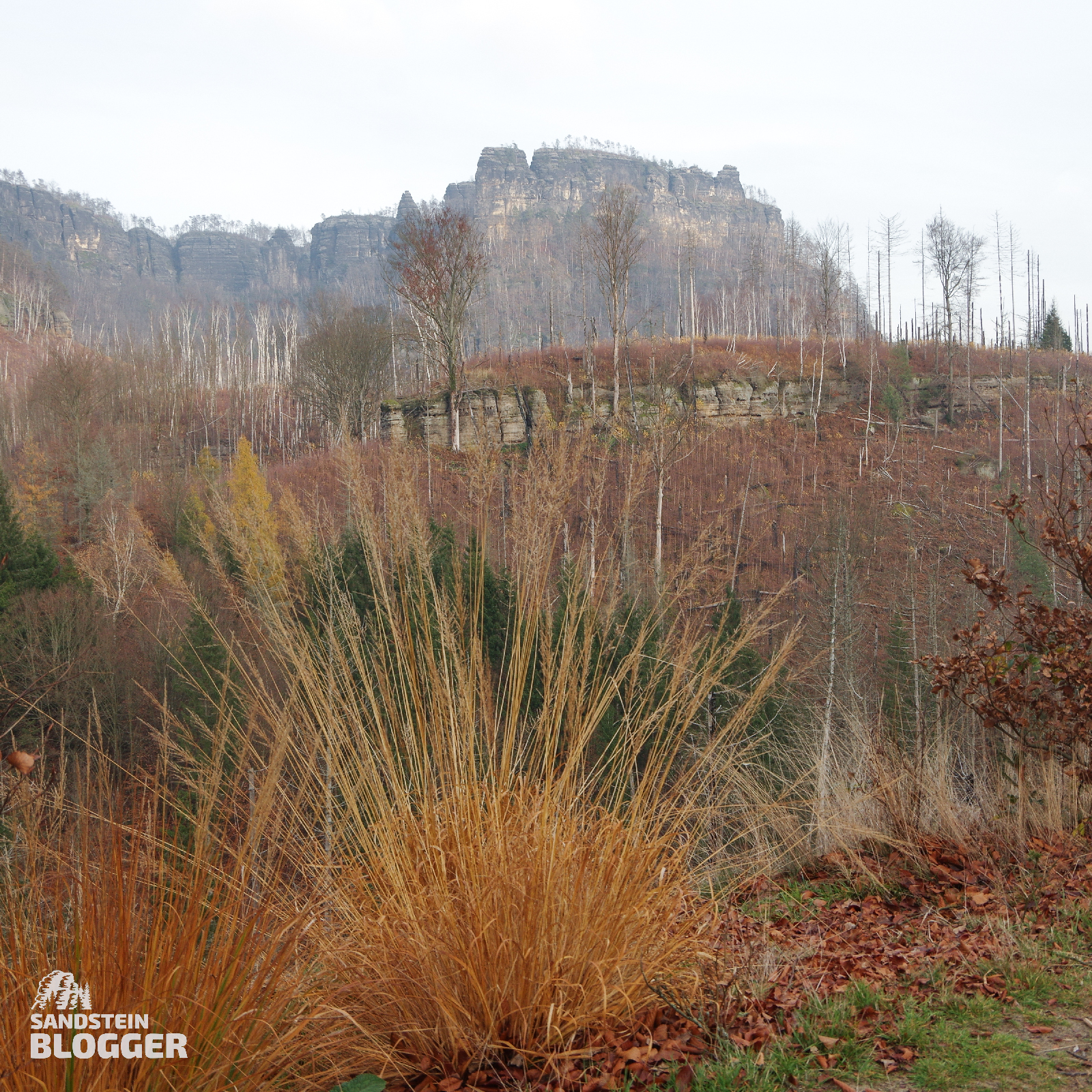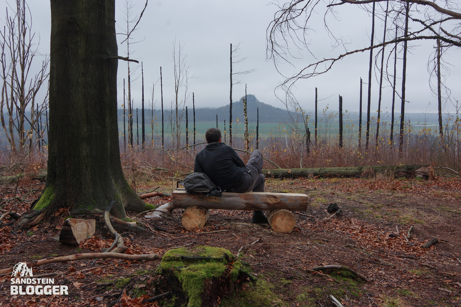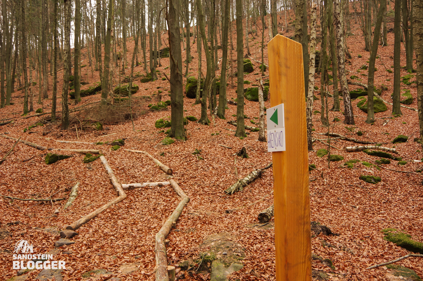 Die neue Route, die direkt vom Grenzweg abzweigt, wurde in den letzten Wochen fertig markiert, ist schon jetzt gut begehbar und eine Empfehlung wert! Denn sie hält selbst für Elbsandsteinkenner einige Überraschungen bereit: z.B. einen hübschen Blick vom Langen Horn (Dlouhý roh) übers Elbtal zum Zirkelstein.