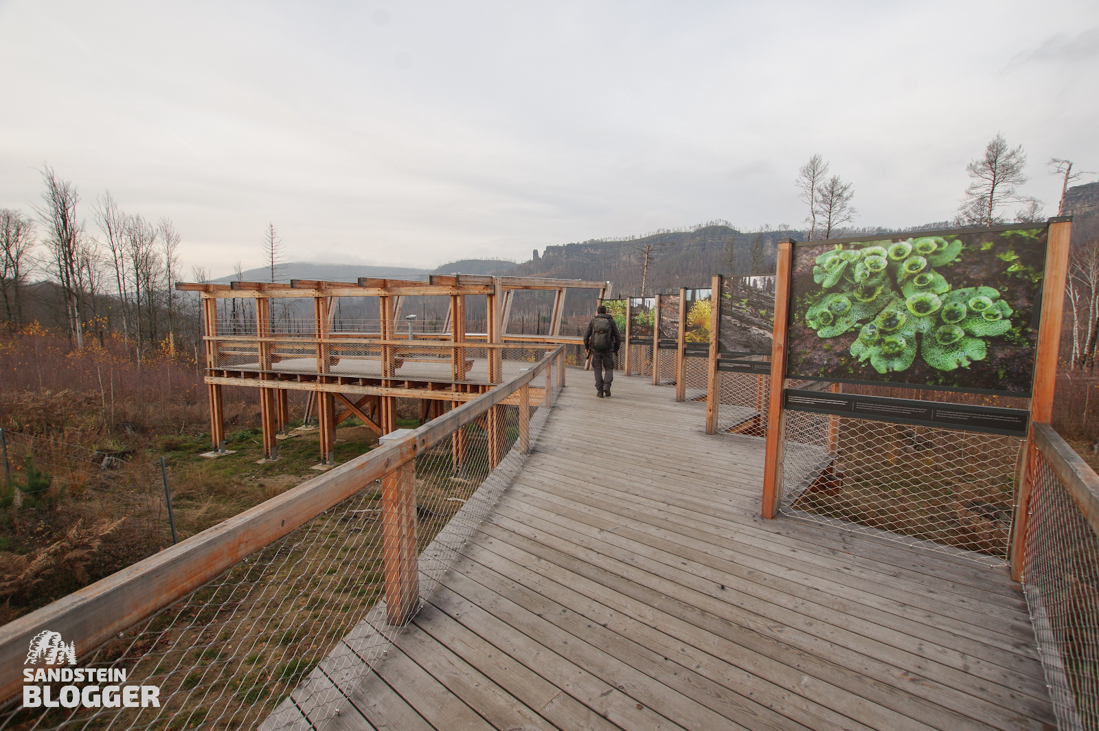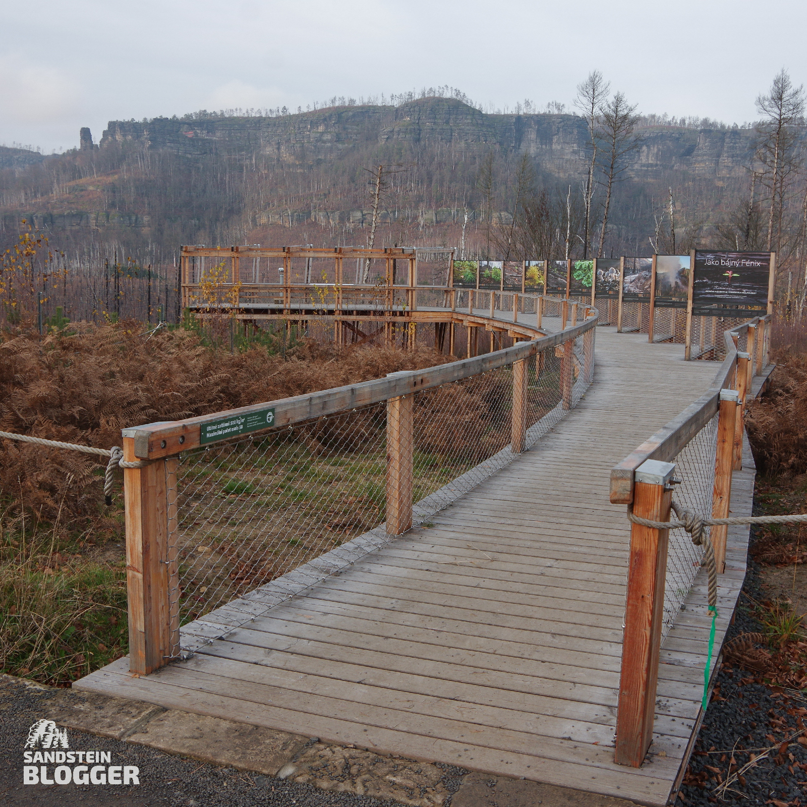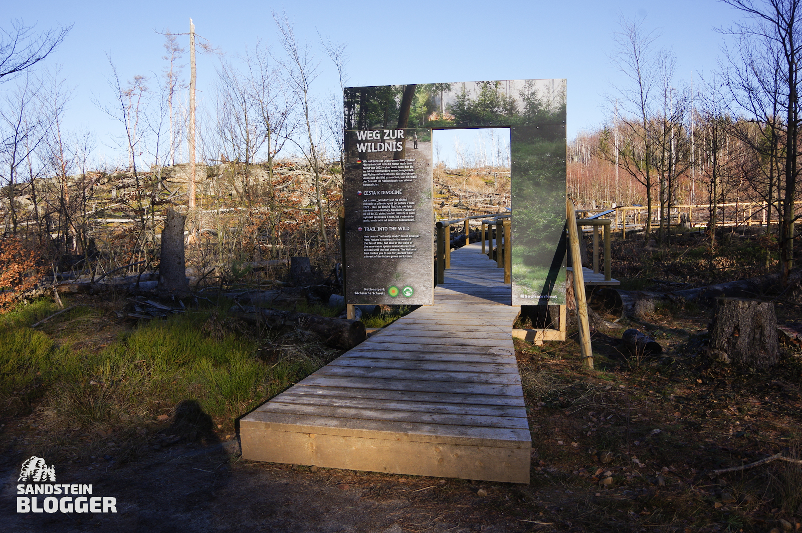 Ähnlich am Reitsteig im Winterberggebiet: Der zweiteilige „Weg zur Wildnis“ führt über eine der Brandflächen auf sächsischer Seite. Anliegen ist es auch hier, zu dokumentieren, wie sich Wald neu entwickelt und diesen anhand von Bildern mit der Situation vor und unmittelbar nach dem Feuer zu vergleichen. Highlight ist eine kleine Plattform mit gutem Geländeüberblick und einer Selfiestation.